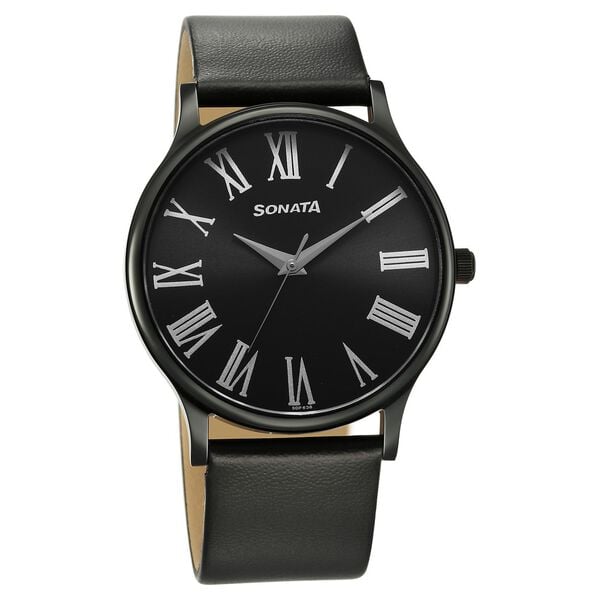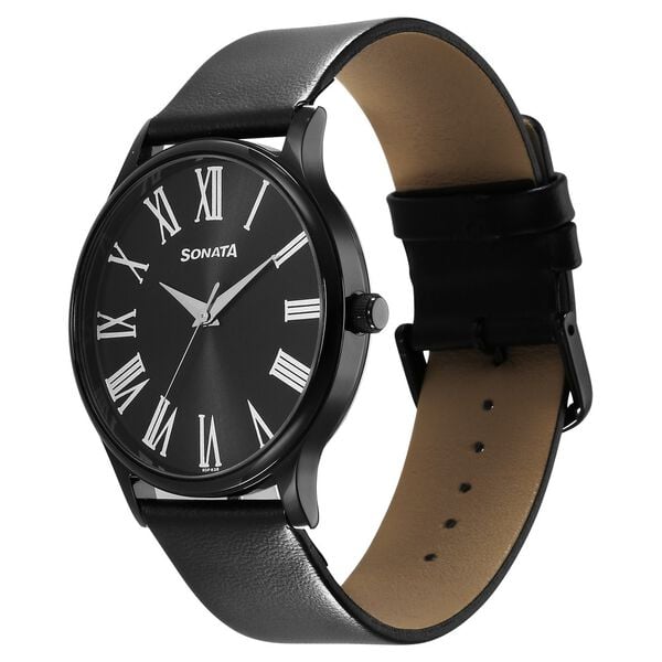 A stylish Men’s Analog Quartz watch featuring a bold black dial with clear three-hand time display. It comes with a comfortable black leather strap, mineral glass protection, and splash-resistant build. Includes a 12-month movement warranty, making it perfect for everyday casual or office wear.