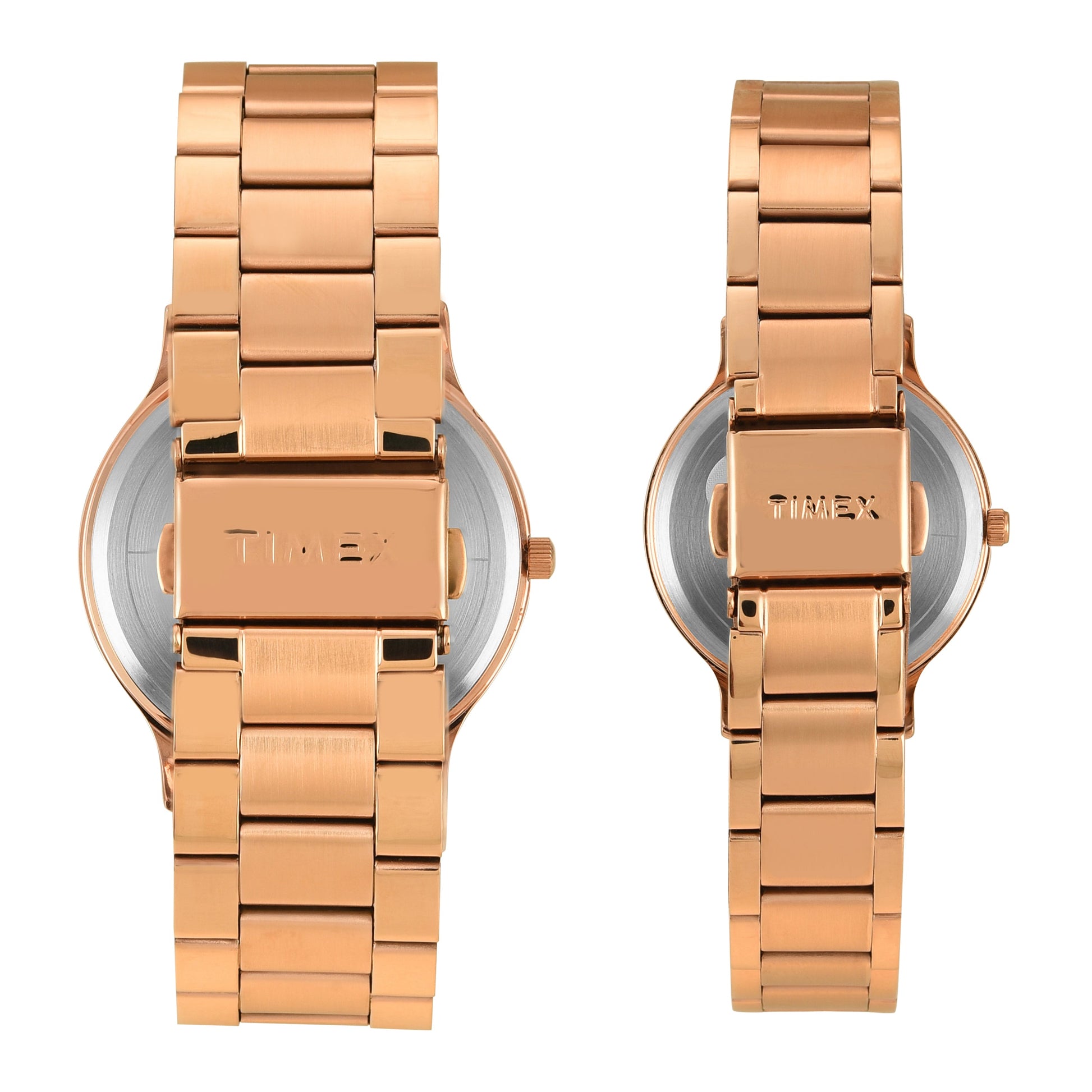 A stylish pair of Analog watches from Timex featuring matching blue round dials and elegant rose-gold stainless-steel straps. These couples watches are powered by reliable Quartz movement with mineral glass protection and 30 m water resistance. Ideal for daily wear or gifting, they come with a 1-year manufacturer warranty.