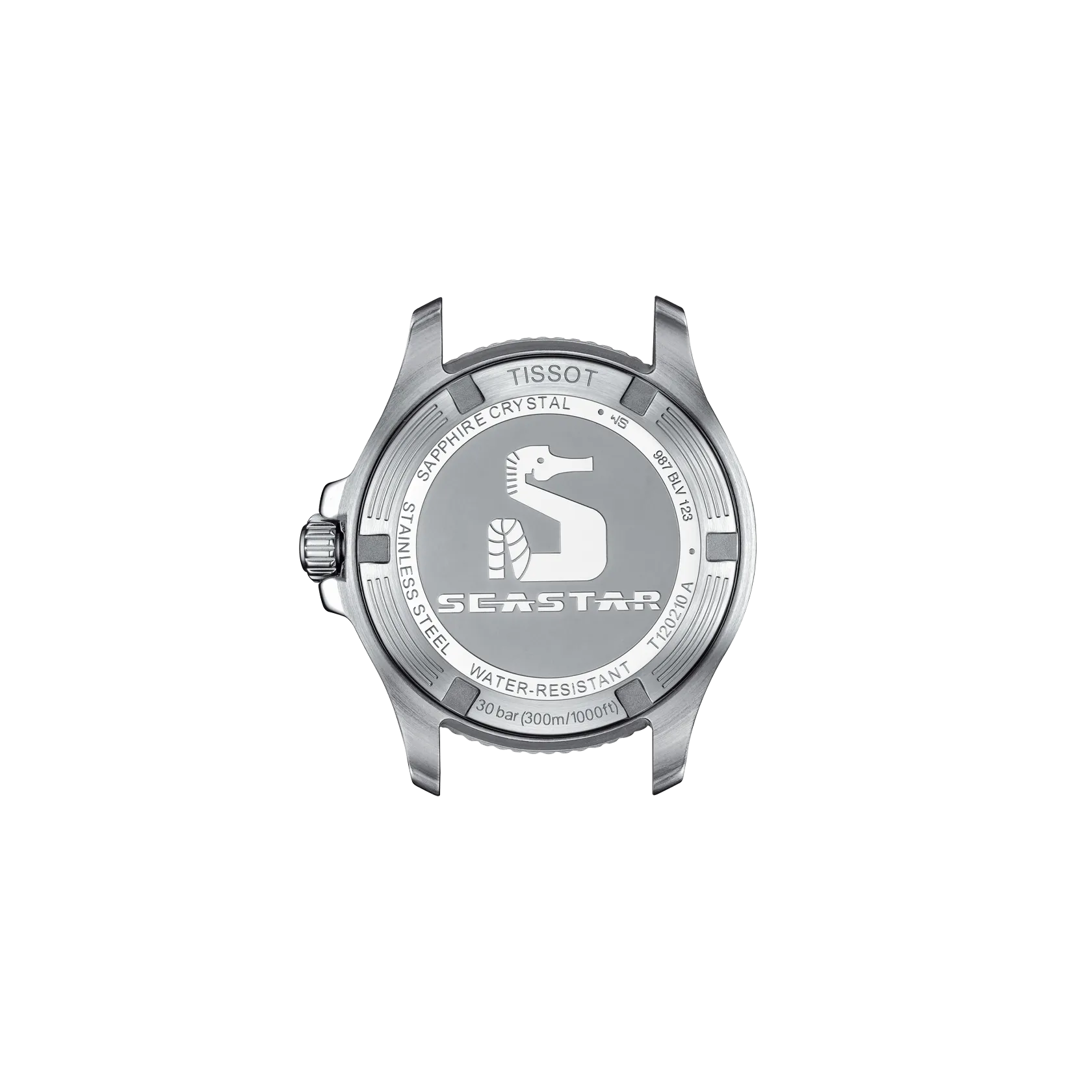 The Tissot T1202102205100 Seastar 1000 is a robust Unisex Swiss Quartz dive watch with a 36 mm black dial and two‑tone stainless steel bracelet. With water resistance up to 30 bar (300 m), a unidirectional rotating bezel, Super‑LumiNova® hands, and a scratch‑resistant sapphire crystal, it blends sporty functionality with refined style.