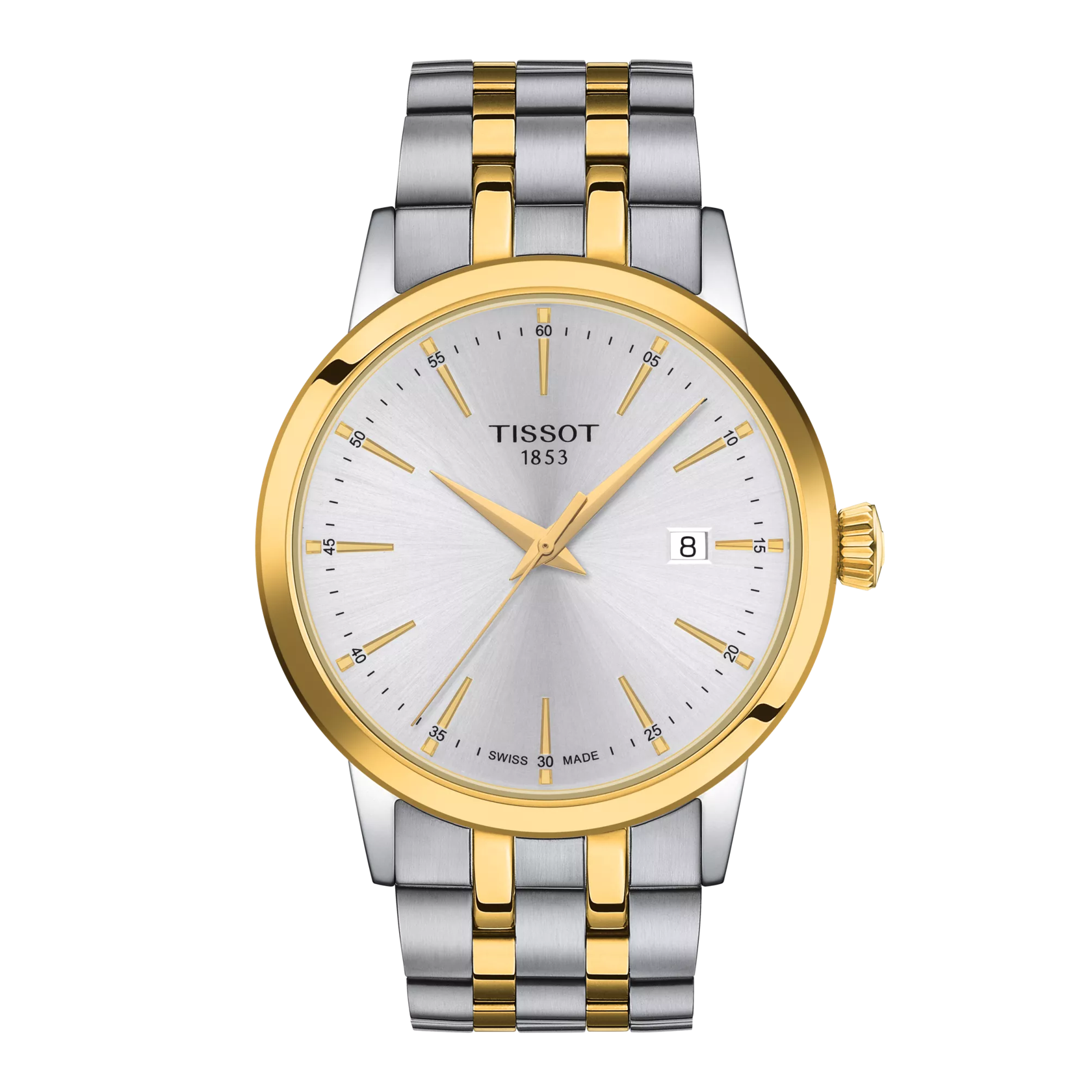 Tissot T1294102203100 is a classic Men Analog Quartz watch featuring a refined silver dial and elegant two-tone stainless steel bracelet with yellow gold PVD accents. With precise Swiss Quartz movement, date display, End-of-Life battery indicator, scratch-resistant sapphire crystal, and 50 m water resistance, it blends timeless design with everyday reliability.