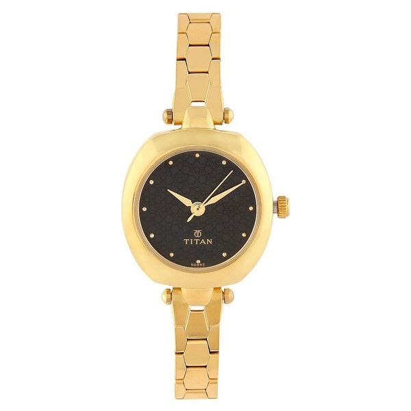 An elegant women’s Quartz Analog watch featuring a sleek black dial and golden stainless steel bracelet. Its compact ~31 mm stainless steel case with mineral glass offers reliable timekeeping and everyday wear. With classic analog display and Titan’s standard warranty, it’s a versatile yet stylish accessory for daily and formal looks.